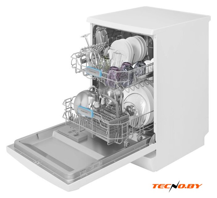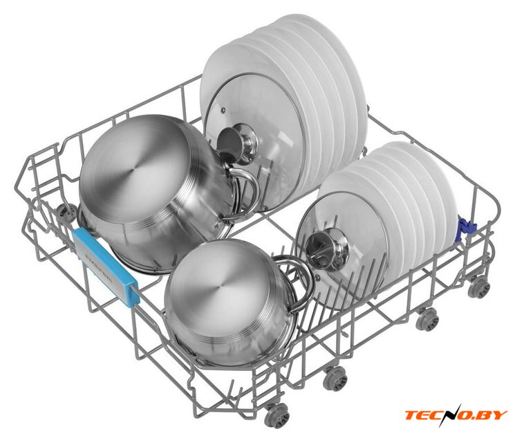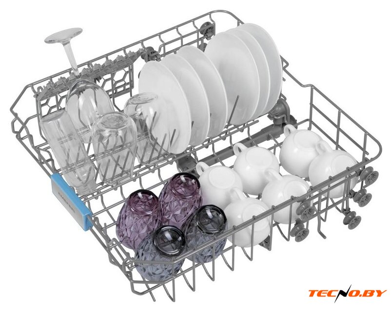 Конструкция посудомоечной машины разработана с учетом комфорта и безопасности: предусмотрена защита от протечек, а также удобная верхняя корзина с функцией регулировки по высоте и держателями для бокалов. Нижняя корзина оснащена складывающимися держателями для удобства размещения большого объема посуды.