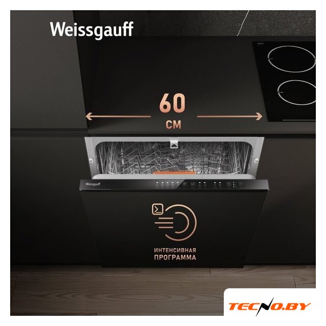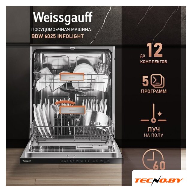 загрузка на 14 комплектов посуды, электронное управление, 7 программ, 59.8x55x82 см, черный цвет, сушка: стандартная (конденсация)/с открыванием дверцы, индикация на полу: луч