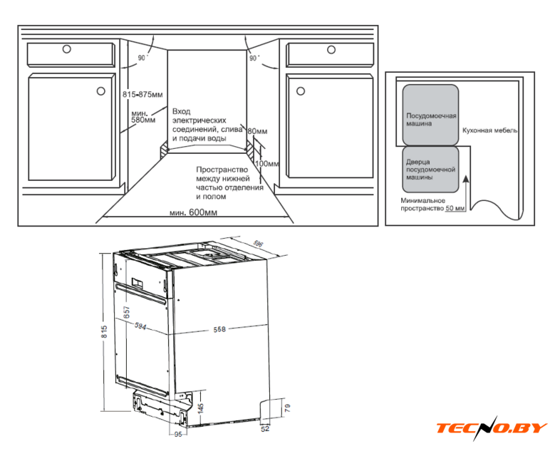 Габариты устройства составляют 59.6 см в ширину, 55.8 см в глубину и 81.5 см в высоту, что позволяет удобно встроить его в кухонную мебель. Обязательно учтите рекомендованные размеры ниши: высота от 81.5 до 87.5 см, ширина 60 см и глубина 58 см.