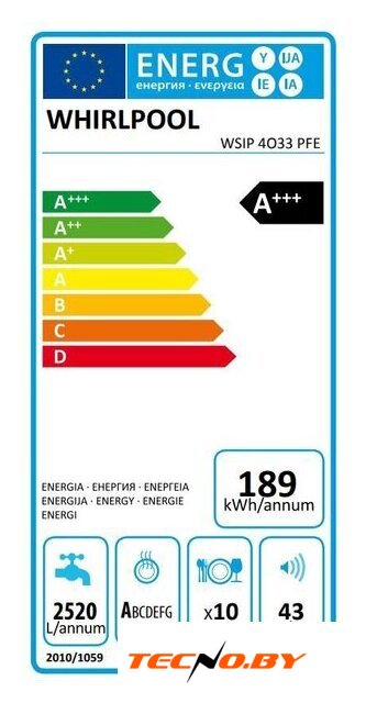 С Whirlpool WSIP 4O33 PFE вы можете быть уверены в её высокой энергоэффективности: класс A+++ обеспечивает минимальное потребление электроэнергии – всего 0.659 кВт·ч за цикл. При этом она расходует лишь 9 литров воды, что делает её как экономичной, так и бережной к окружающей среде. Уровень шума в 43 дБ обеспечивает её практически бесшумную работу, не отвлекая от повседневных дел.