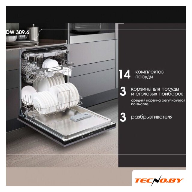 загрузка на 14 комплектов посуды, электронное управление, 7 программ, 59.8x55x82 см, серебристый цвет, сушка: стандартная (конденсация)/с открыванием дверцы, индикация на полу: луч