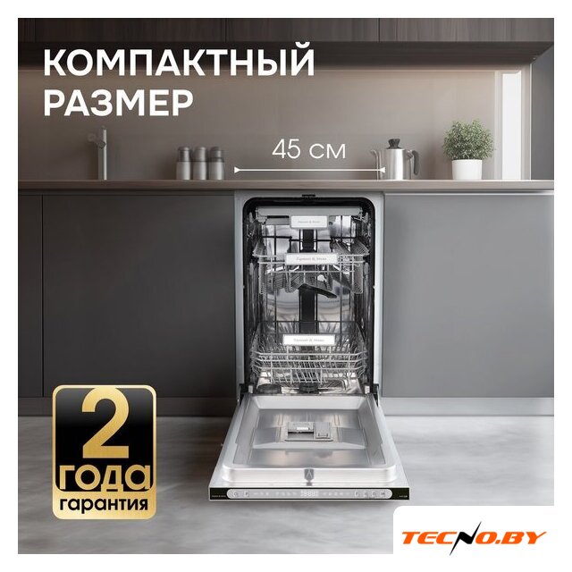загрузка на 10 комплектов посуды, электронное управление, 6 программ, 44.8x55x82 см, серебристый цвет, сушка: стандартная (конденсация), индикация на полу: луч