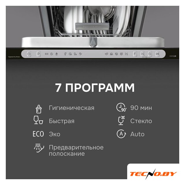 | Дополнительные опции | сокращение времени мойки, дополнительная сушка, усиление интенсивности мойки (гигиеническая мойка), половинная загрузка (экономия воды) |