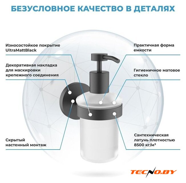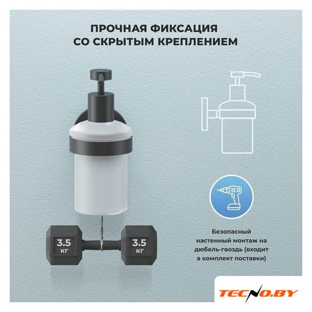 | Комплектация | Дозатор для жидкого мыла с держателем и крепежным комплектом для настенного монтажа |