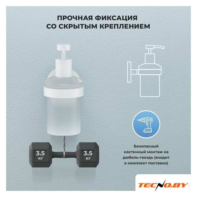 | Комплектация | Дозатор для жидкого мыла с держателем и крепежным комплектом для настенного монтажа |