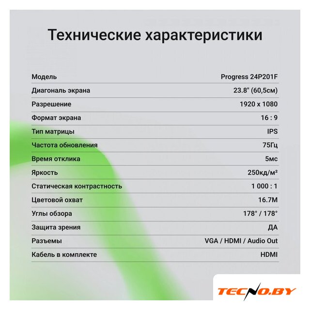 23.8", 16:9, 1920x1080, IPS, 75 Гц, AMD FreeSync, интерфейсы HDMI+D-Sub (VGA)