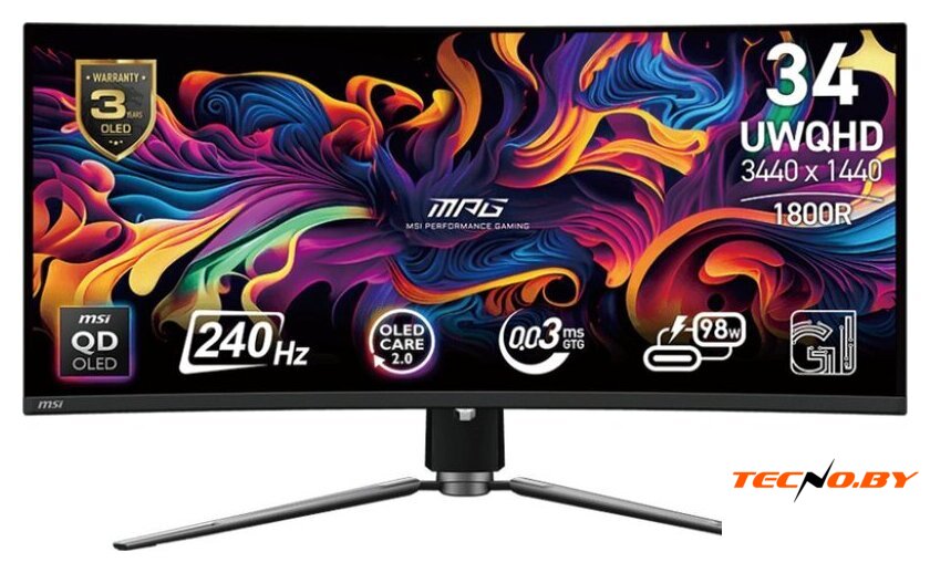 34", 21:9, 3440x1440, OLED, изогнутый (1800R), 165 Гц, AMD FreeSync Premium Pro, интерфейсы HDMI+DisplayPort, регулировка высоты