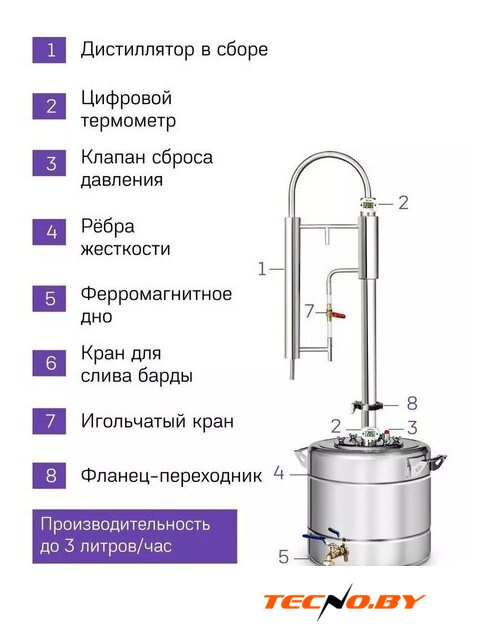 бытовой дистиллятор, нержавеющая сталь, объем перегонного куба 20 л, толщина стенок 1.5 мм