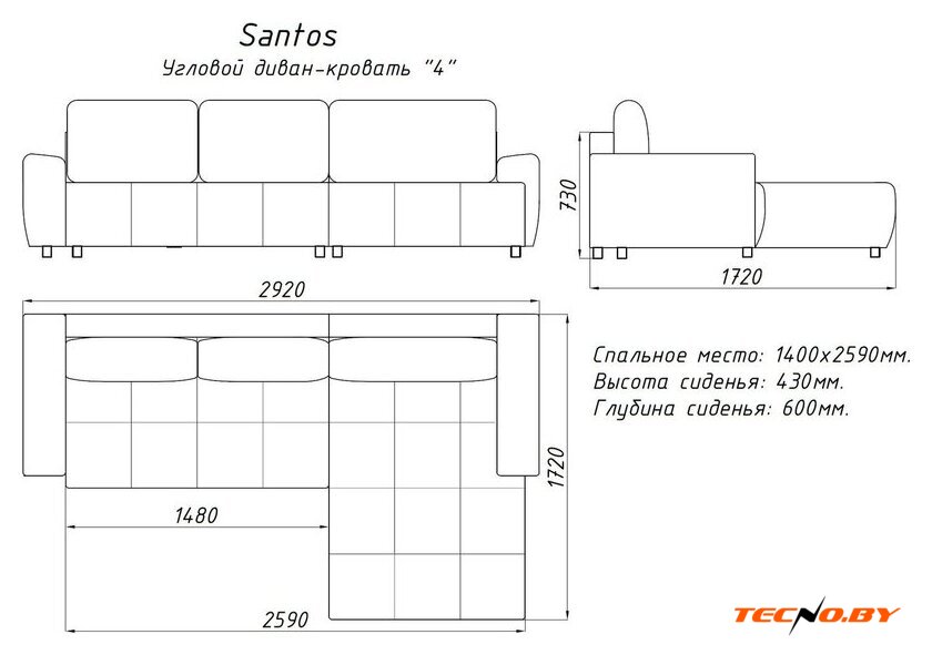 раскладной, механизм "еврокнижка", настил пенополиуретан (поролон), длина 292 см, спальное место 259x140 см