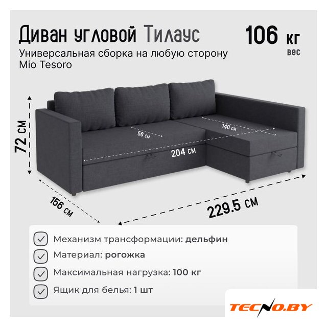 раскладной, механизм "дельфин", настил пенополиуретан (поролон), длина 229.5 см, спальное место 204x140 см