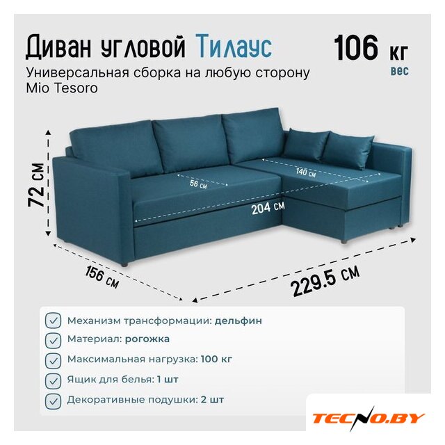 раскладной, механизм "дельфин", настил пенополиуретан (поролон), длина 229.5 см, спальное место 204x140 см