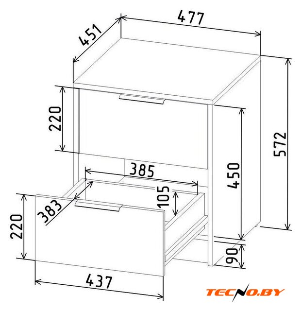 для жилой комнаты, для гостиной, для спальни, каркас ЛДСП+ХДФ, фасад ЛДСП, 2 ящика, 40x45x55.1 см