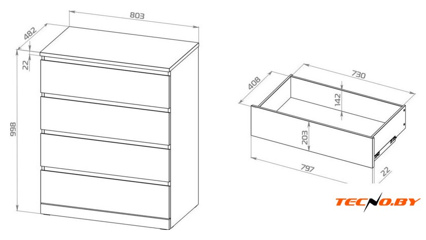 для спальни, для жилой комнаты, для гостиной, каркас ЛДСП, фасад ЛДСП, 4 ящика, 91x49x88 см