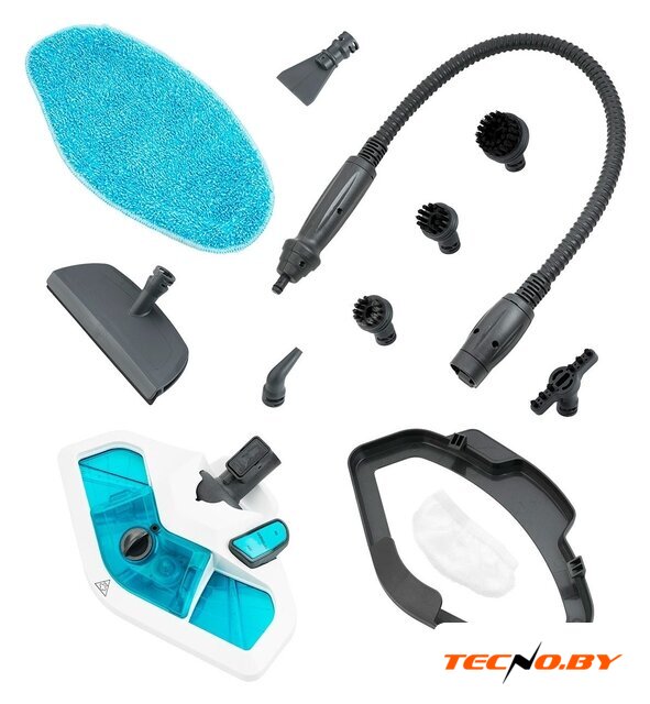 | Дополнительные насадки и приспособления | Рамка для ковра, Маленькая круглая нейлоновая щетка, Большая круглая нейлоновая щетка, Круглая латунная щетка, Угловая насадка, Скребок, Плоская нейлоновая щетка, Насадка для отпаривания, Тряпка для отпаривания, Стакан для наливания воды |
