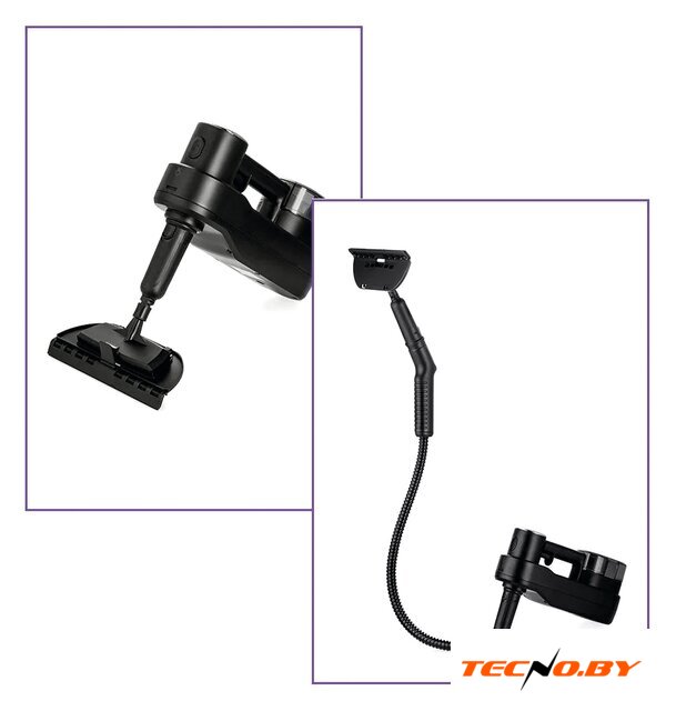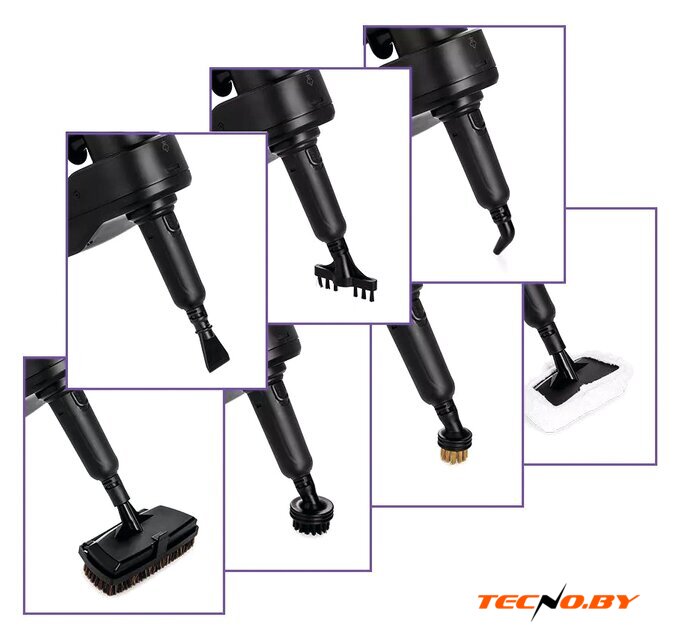 | Комплектация | Скребок, латунная и нейлоновые щётки очищают сложные загрязнения за счёт механического воздействия. Для очистки окон, зеркал и кафельной плитки используется скребок для стекла с резиновой вставкой. Струйная и угловая насадки помогут очистить щели и углы. |