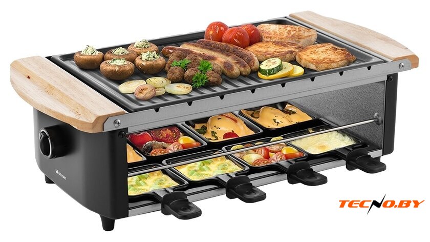 | Комплектация | Раклетница - 1 штПанель с антипригарным покрытием - 1 штПорционные сковородки с антипригарным покрытием - 8 штШпажки - 8 штРуководство по эксплуатации - 1 штГарантийный талон - 1 шт |