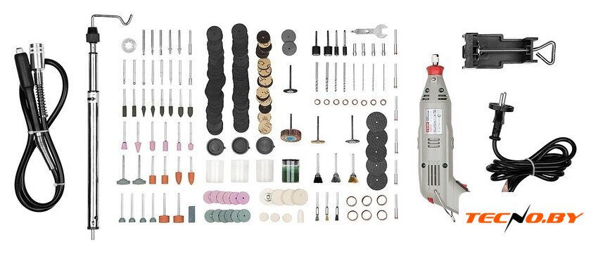 | Комплектация | Гибкий вал 105см - 1шт.Подставка для штатива - 1шт. Штатив - 1шт.Абразивные шлифовальные цилиндры - 14шт.Войлочный полировальный круг - 1шт.Фетровые полировальные круги - 6шт. Державка для фетрового круга - 1шт. Резиновый полировальный круг - 2шт. Сверла по металлу - 8шт.Державки для шлифовальных цилиндров - 4шт. Шарошки алмазные - 8шт.Шарошки металлические - 3шт.Круг отрезной алмазный - 1шт. Круг резиновый шлифовальный с хвостовиком - 8шт. Абразивные шлифовальные круги по металлу с хвостовиком - 12шт.Абразивные шлифовальные круги по металлу - 6шт.Абразивные шлифовальные круги по камню с хвостовиком - 6шт.Абразивные шлифовальные круги по камню - 6шт.Щетки-крацовки - 9шт. Круги шлифовальные - 45шт.Усиленные отрезные абразивные круги - 30шт.Отрезные абразивные круги - 46шт.Цанги хромированные - 4шт. Оправы - 9шт.Отрезные армированные круги - 5шт.Круг лепестковый торцевой - 1шт. Ключ комбинированный монтажный - 1шт. Брусок абразивный правочный - 1 шт. Паста полировальная - 1шт. |
