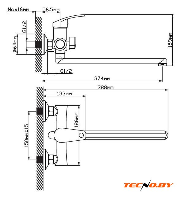 однорычажный смеситель для ванны, монтаж на стену