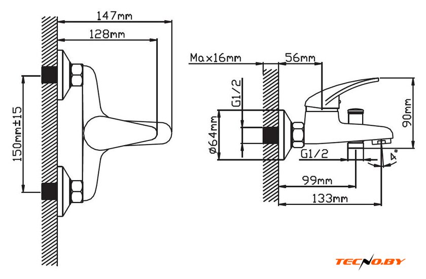 двухвентильный смеситель для ванны и душа, монтаж на стену