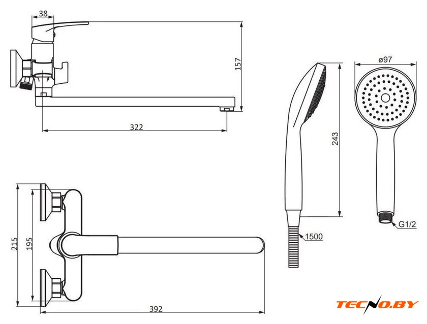 однорычажный смеситель для ванны и душа, монтаж на стену