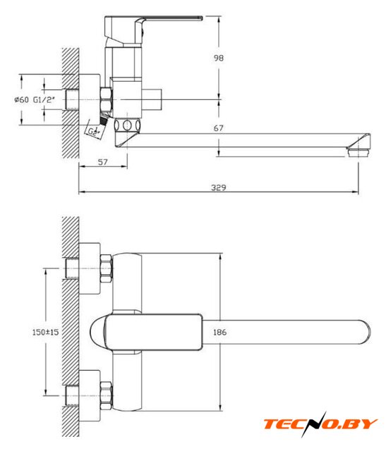 однорычажный смеситель для ванны и душа, монтаж на стену