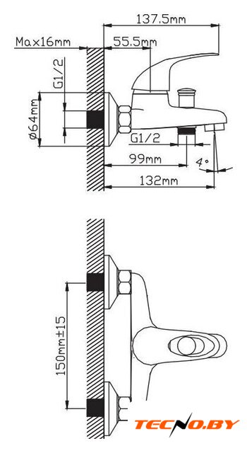 двухвентильный смеситель для ванны и душа, монтаж на стену