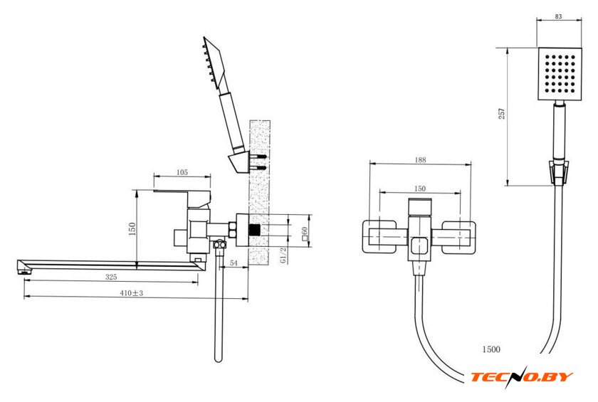 однорычажный смеситель для ванны и душа, монтаж на стену