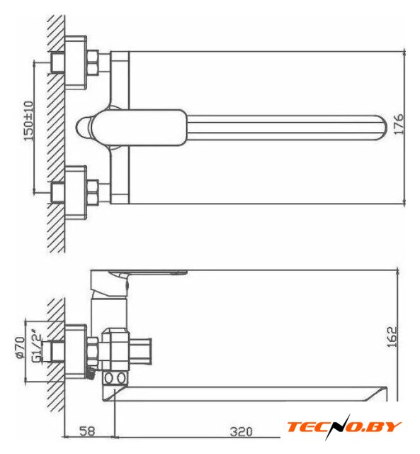 однорычажный смеситель для ванны, монтаж на стену