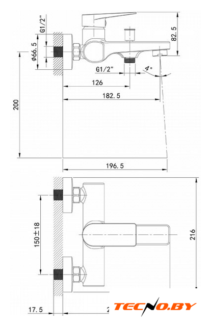 однорычажный смеситель для ванны и душа, монтаж на стену
