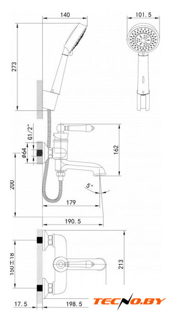 однорычажный смеситель для ванны и душа, монтаж на стену