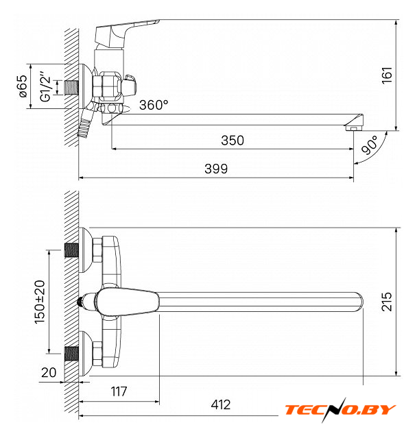 однорычажный смеситель для ванны и душа, монтаж на стену