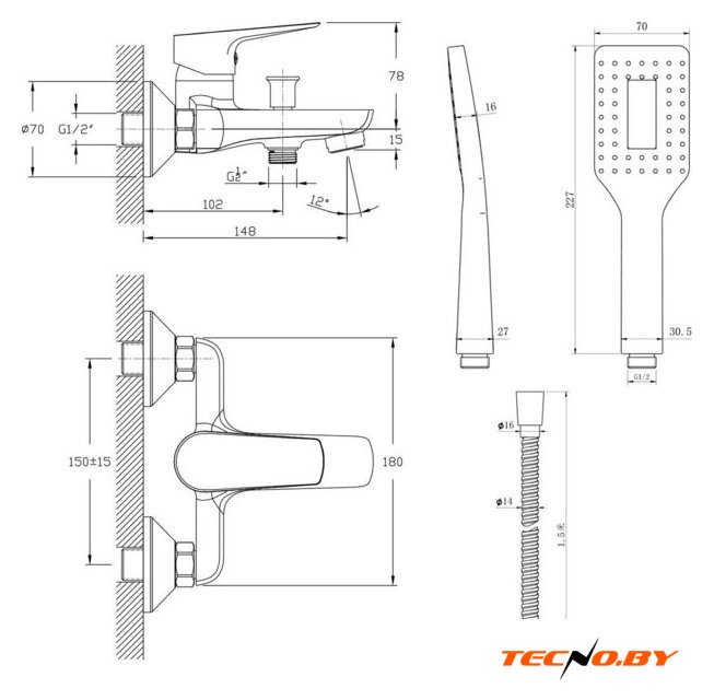 однорычажный смеситель для ванны и душа, монтаж на стену