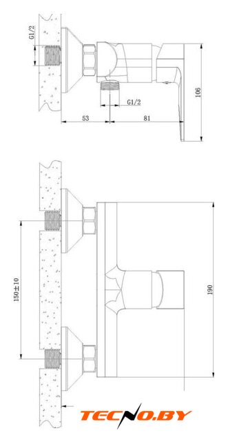 двухвентильный смеситель для ванны и душа, монтаж на стену