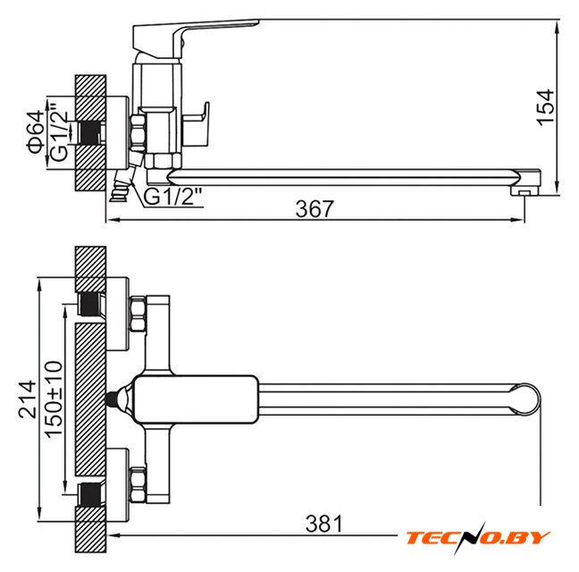 однорычажный смеситель для ванны и душа, монтаж на стену