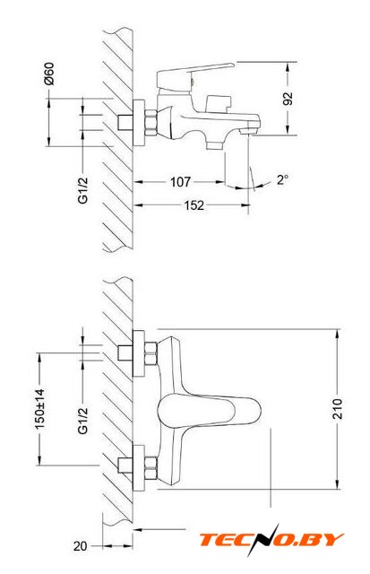 однорычажный смеситель для ванны и душа, монтаж на стену
