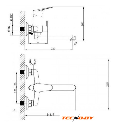 однорычажный смеситель для ванны и душа, монтаж на стену