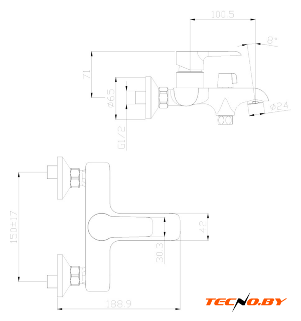 однорычажный смеситель для ванны и душа, монтаж на стену