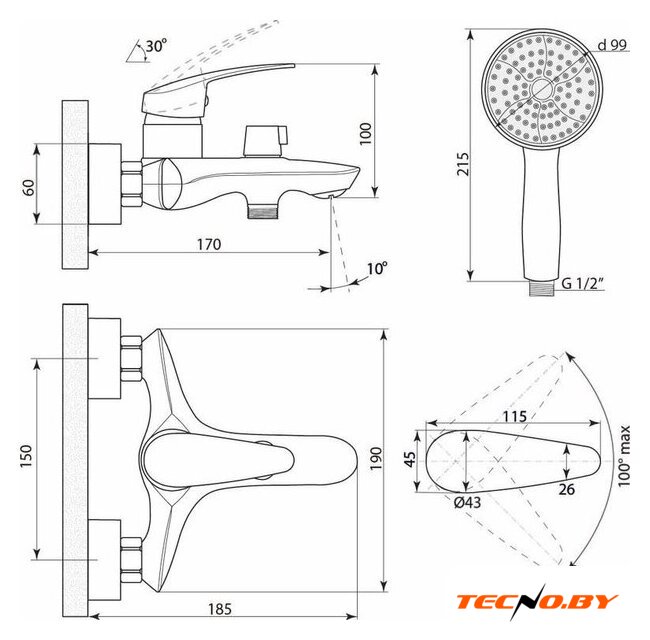 однорычажный смеситель для ванны и душа, монтаж на стену