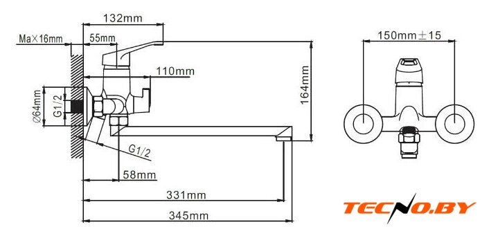 двухвентильный смеситель для ванны и душа, монтаж на стену