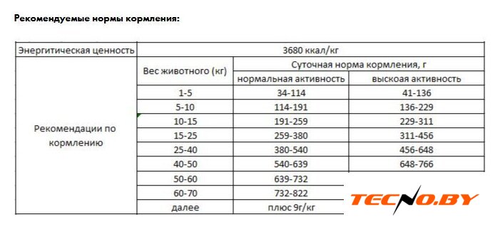 | Питательные вещества | витамин А 20 000 МЕ; витамин Д 1 800 МЕ; витамин Е 250 мг; витамины группы В 2 100 мг; витамин С 50 мг; пантотеновая кислота 20 мг; ниацин 22 мг; железо 50 мг; медь 12 мг; цинк 150 мг; йод 4,0 мг; селен 0,2 мг; марганец 20 мг; глюкозамин 550 мг/кг; хондроитин 300 мг/кг |