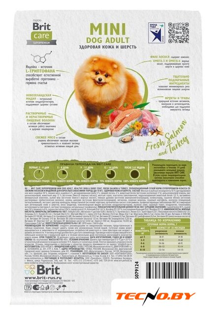 | Ингредиенты | мясные и рыбные ингредиенты 42% (дегидрированное мясо индейки 24%, свежее мясо индейки 6%, дегидрированная рыба 5%, свежий лосось 4%, животный белок (источник коллагена) 3%), цельнозерновой ячмень, рис цельнозерновой, животный жир 12% (источник омега–6 жирных кислот), желтый горох, клетчатка свекловичная, гидролизованный животный белок 3.5%, витаминно–минеральный комплекс, рыбий жир (источник омега–3 жирных кислот), пивные дрожжи (источник маннанолигосахаридов), холинхлорид, сушеное яблоко (источник растворимых пребиотических волокон), корень цикория (источник фруктоолигосахаридов), метионин, сушеная морковь, сушеный картофель, коллаген (очищенный, легкоусвояемый), экстракт цветков календулы лекарственной (источник каротина, органических кислот и витаминов, профилактирующих заболевания ЖКТ и стимулирующих регенерацию кожи и шерсти), юкка Шидигера, новозеландская мидия (источник хондропротекторов), льняное семя, сушеный томат, хондроитин, глюкозамин, антиоксиданты (витамин Е, экстракт розмарина, натуральные токоферолы) |