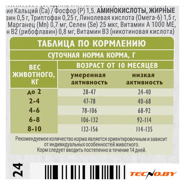 | Питательные вещества | лейцин 0.95 г, метионин+цистеин 0.85 г, валин 0.7 г, аргинин 0.6 г, лизин 0.5 г, триптофан 0.25 г, линолевая кислота (омега–6) 1.5 г, хлориды 0.2 г, калий (К) 0.6 г, натрий (Na) 0.15 г, магний (Mg) 0.1 г, цинк (Zn) 9 мг, железо (Fe) 6 мг, медь (Cu) 1 мг, марганец (Mn) 0.7 мг, селен (Se) 25 мкг, витамин A 1000 МЕ, витамин D3 100 МЕ, витамин E (α–токоферол) 6 МЕ, витамины группы В 215.2 мг: витамин В1 (тиамин) 0.3 мг, витамин В2 (рибофлавин) 0.8 мг, витамин В3 (никотиновая кислота) 2 мг, витамин В4 (холин) 210 мг, витамин В5 (пантотеновая кислота) 1.8 мг, витамин В6 (пиридоксин) 0.25 мг, витамин В7 (биотин) 0.01 мг, витамин В9 (фолиевая кислота) 0.032 мг, омега–3 900 мг, хондроитин 10.035 мг, глюкозамин 2.867 мг |
