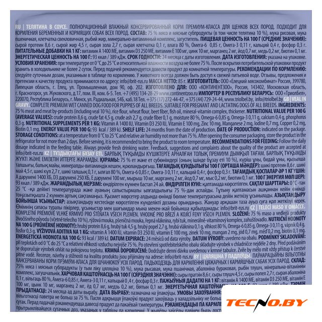 | Ингредиенты | продукты мясной переработки; злаки; телятина; злаки |