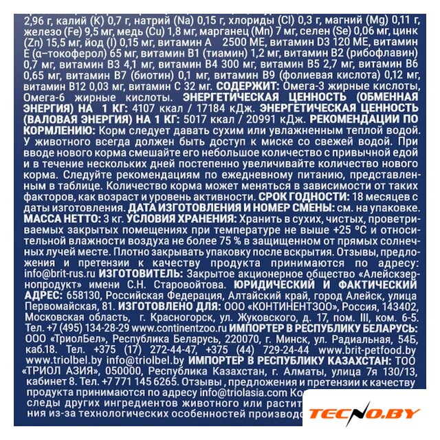 | Ингредиенты | дегидрированная курица 38%; кукуруза; куриный жир; клетчатка свекловичная; гидролизированная куриная печень 3%; рис 2%; дрожжи пивные; витаминно-минеральный комплекс; семя льняное; хлористый калий; метионин; лизин; оксид магния; рыбий жир; соль поваренная; таурин; высушенные клеточные стенки дрожжевой культуры; юкка Шидигера; хондропротекторы (глюкозамин и хондроитин); L-карнитин; натуральные антиоксиданты (смесь токоферолов) |