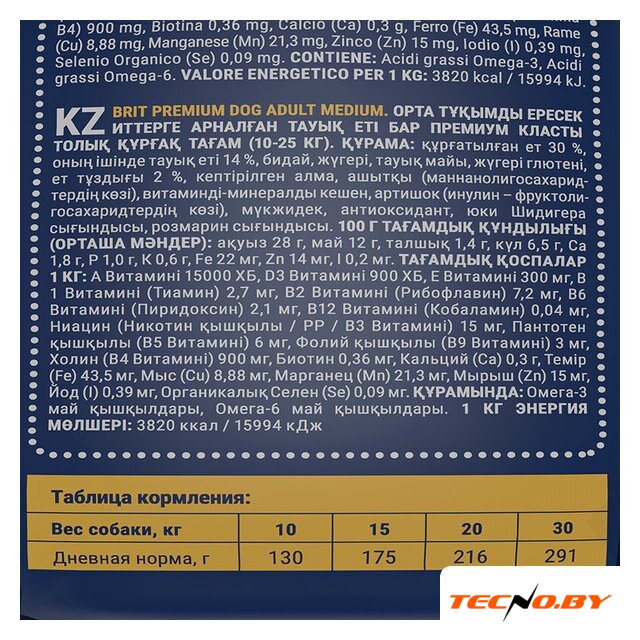 | Питательные вещества | белок 28 г, жир 12 г, клетчатка 1,4 г, зола 6,5 г, са 1,8 г, P 1,0 г., К 0,6 г, FE 22 мг, ZN 14 мг, I 0,2 мг. Питательные добавки на 1 кг: витамин А 15000 МЕ, витамин Д3 900 МЕ, витамин Е 300 мг, витамин B1 (тиамин) 2,7 мг, витамин B2 (рибофлавин) 7,2 мг, витамин B6 (пиридоксин) 2,1 мг, витамин B12 (кобаламин) 0,04 мг, ниацин (никотиновая к-та /витамин РР / в3) 15 мг, пантотеновая к-та (витамин в5) 6 мг, фолиевая к-та (витамин в9) 3 мг, холин (витамин в4) 900 мг, биотин 0,36 мг, кальций (са) 0,3 г, железо (Fe) 43,5 мг, медь (Cu) 8,88 мг, марганец (Mn) 21,3 мг, цинк (Zn) 15 мг, йод (I) 0,39 мг, селен органический (Se) 0,09 мг. Содержит: Омега-3 жирные кислоты, Омега-6 жирные кислоты. |