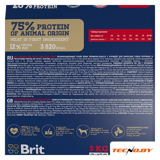 | Ингредиенты | дегидрированное мясо 30 %, в том числе мясо курицы 14 %, пшеница, кукуруза, жир куриный, глютен кукурузный, мясной соус 2 %, яблоко сушеное, дрожжи (источник маннанолигосахаридов), витаминно-минеральный комплекс, топинамбур (инулин - источник фруктоолигосахаридов), антиокислитель, глюкозамин, хондроитин, экстракт юкки Шидигера, экстракт розмарина. |