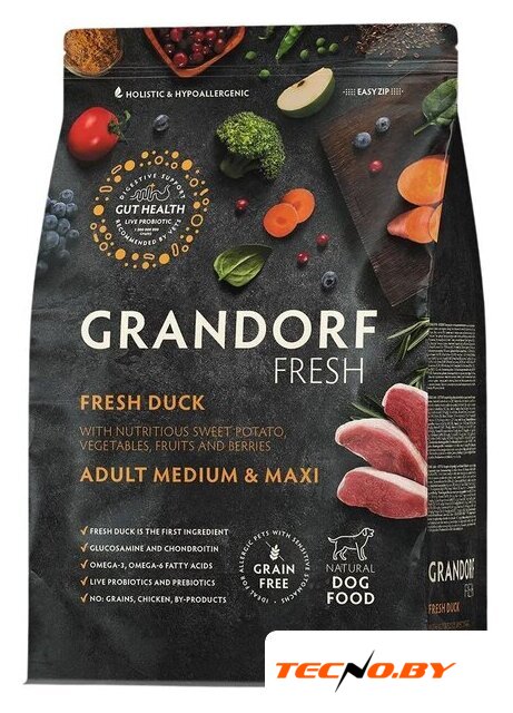 | Ингредиенты | свежее бескостное мясо утки, дегидрированное мясо индейки, батат, горох, картофель, порошок корней цикория, минералы, льняное семя, яблоки, морковь, пивные дрожжи, масло лосося, клюква, черника, брокколи, шпинат, помидоры, глюкозамина гидрохлорид, хондроитина сульфат, юкка шидигера, грейпфрут, розмарин, куркума |