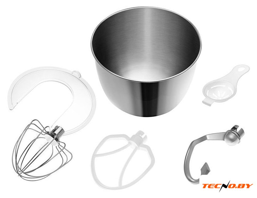 | Полная комплектация | Венчик для взбиванияКрюк для замешивания тестаНасадка для смешиванияОтделитель белков от желтковЗащитная крышка чаши |