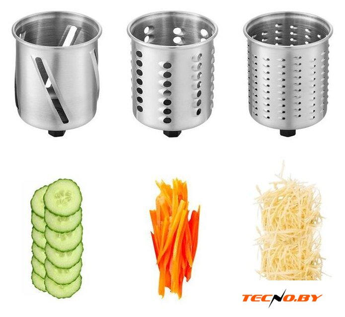 | Полная комплектация | Шинковка подходит для нарезки тонких гладких ломтиков из картофеля, кабачков, капусты, яблок. Крупная тёрка измельчает морковь, перец, сыр, твёрдый сыр. Мелкая тёрка предназначения для измельчения и тёрки сыра, сухарей, орехов и многого другого. |