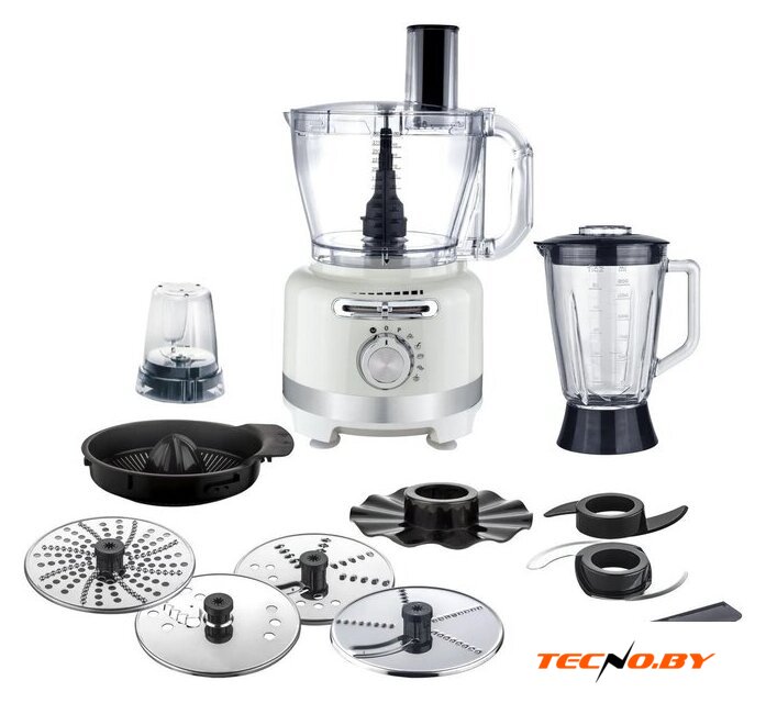 | Полная комплектация | • Моторное основание;• Чаша измельчителя;• Толкатель;• Длинный вал;• Короткий вал;• Блендер с крышкой;• Диск эмульгатор;• Нож для измельчения;• Нож для теста;• Лопатка;• Диск – 4 шт (лезвие для нарезки картофеля фри; двухстороннее лезвие для крупной шинковки – диск-жюльен; двухстороннее лезвие для мелкой шинковки – диск-жюльен; терка для драников);• Соковыжималка;• Кофемолка;• Руководство пользователя |